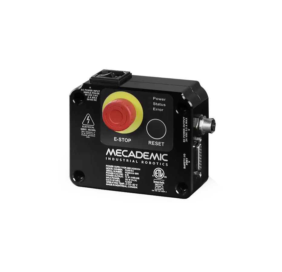 The PS200-R4 is Mecademic’s dedicated industrial power supply for the Meca500 series of 6-axis robotic arms. Engineered for reliability and precision, it delivers a stable 24 V DC output and integrates seamlessly with Mecademic’s plug-and-work architecture. The PS200-R4 features a compact, industrial-grade design with an integrated emergency stop button, making it ideal for both bench-top and production environments.